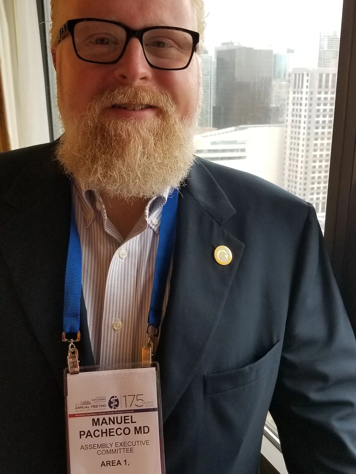 Manuel Pacheco, M.D., is the immediate past Area 1 Representative to the APA Assembly Executive Committee (AEC). He also served as the Area 1 Deputy Representative to the APA AEC after having been the Senior Representative to the APA Assembly of District Branches for the Massachusetts Psychiatric Society.